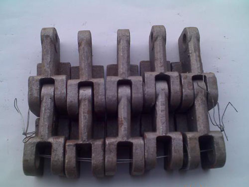 鱗片式爐排適用于蒸發(fā)量10~60t/h的鍋爐.其爐排面通常由4~12根互相平行的鏈條(類似自行車上的鏈條結(jié)構(gòu))組成.每根鏈條用鋤栓將若干個由大環(huán)、小環(huán)、墊圈、襯管等元件組成的鏈條串在一起.往復(fù)爐排通過夾板組裝在鏈條上,前后交疊,相互緊貼,呈魚鱗狀。